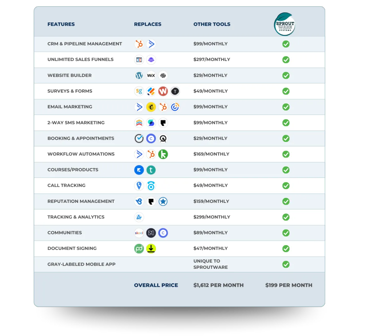 Yes! That's what the Fast Track Onboarding is all about. We’ll import your contacts, connect your email, calendars, and payments, and replace your existing tools so you can run everything in one system. Have a platform you love? Sproutware integrates with so many platforms!
